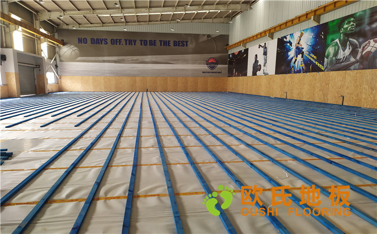 江蘇昆山市博瑞祥汽車公司籃球館木地板案例,項目采用的是歐氏地板籃球館專用雙層龍骨結構楓樺木運動地板。