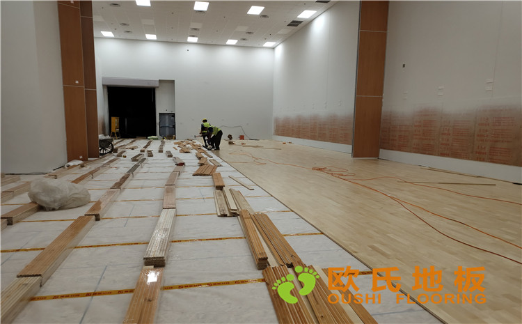 北京環球影城籃球館運動木地板案例,項目案例使用歐氏地板籃球館專用單層龍骨結構運動地板,施工面積344平米。