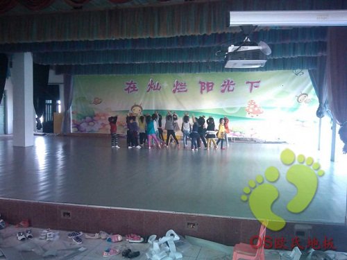 招遠市實驗幼兒園鋪設歐氏進口舞蹈地板296平方米,分為兩個舞臺,顏色為常見的淺灰色,鋪設方法采用固定式安裝。